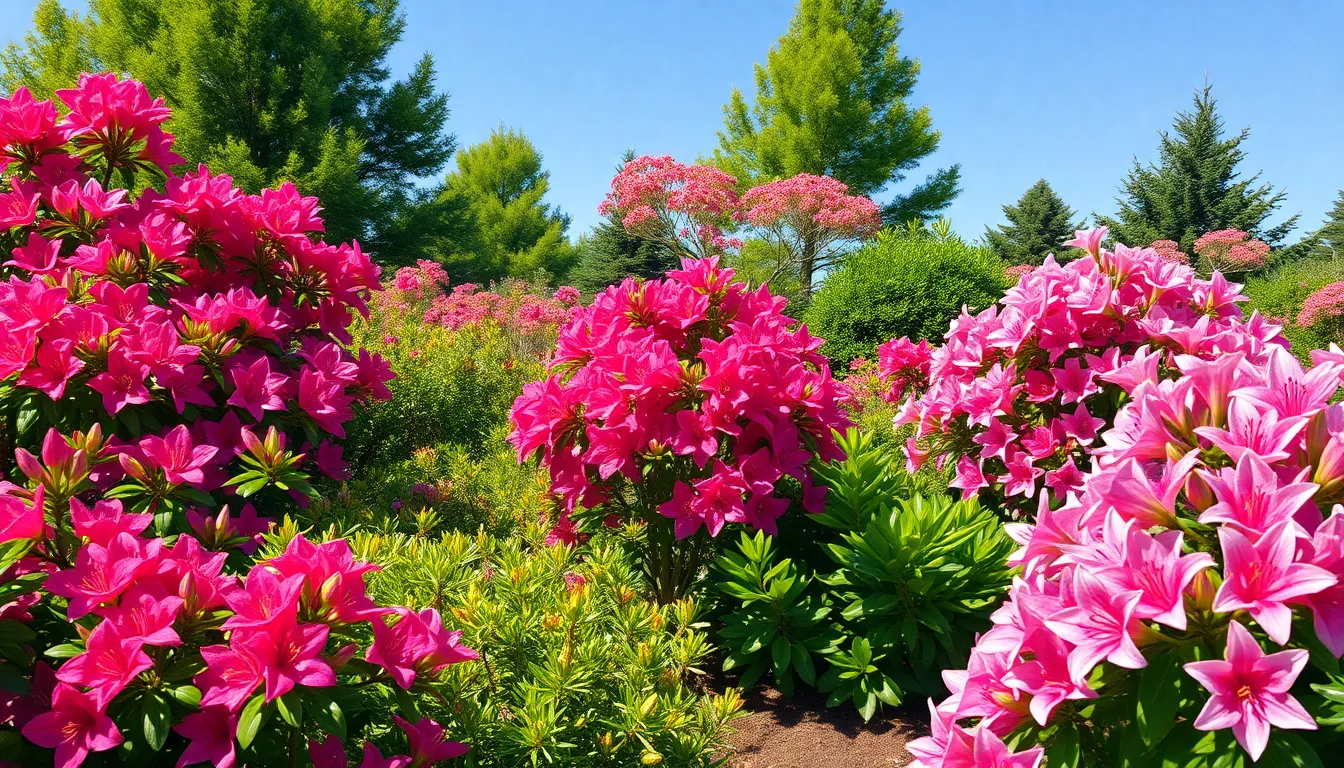 Deciduous azaleas shed their leaves in the fall. They showcase vibrant blooms in spring, offering an impressive display of colors. Notable varieties include the Ghost Hill azalea and the P.J.M. rhododendron, celebrated for their spectacular blossoms and seasonal transformation. Evergreen azaleas retain foliage year-round, providing consistent greenery. For example, varieties like the Encore azalea bloom multiple times throughout the year, enhancing visual interest with each cycle.