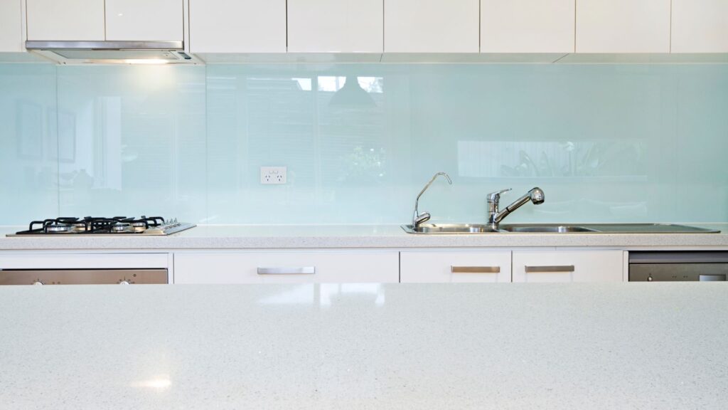 All properly manufactured glass splashbacks use toughened safety glass. This isn’t standard glass — it’s heat-treated to significantly increase its strength and thermal resistance.